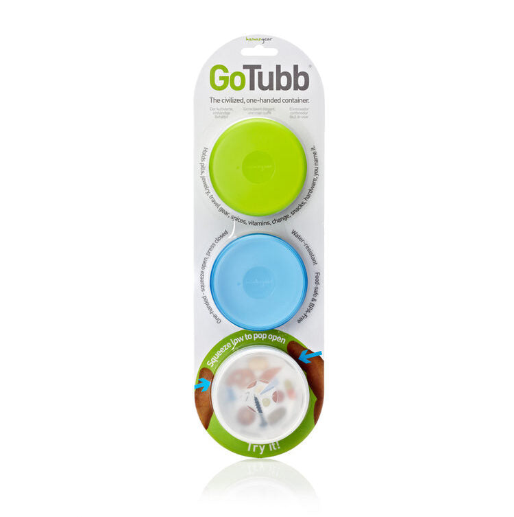 Patented worldwide, the GoTubb's ingenious design opens and closes with just one hand. These travel containers are great for pills, knick-knacks, snacks, vitamins, change, or just about anything. The small size will fit a few pills, a stack of quarters, or two sets of earplugs. The medium size will fit a bottle's worth of pills, a few dollars in change, some trail mix, earbuds, and more.