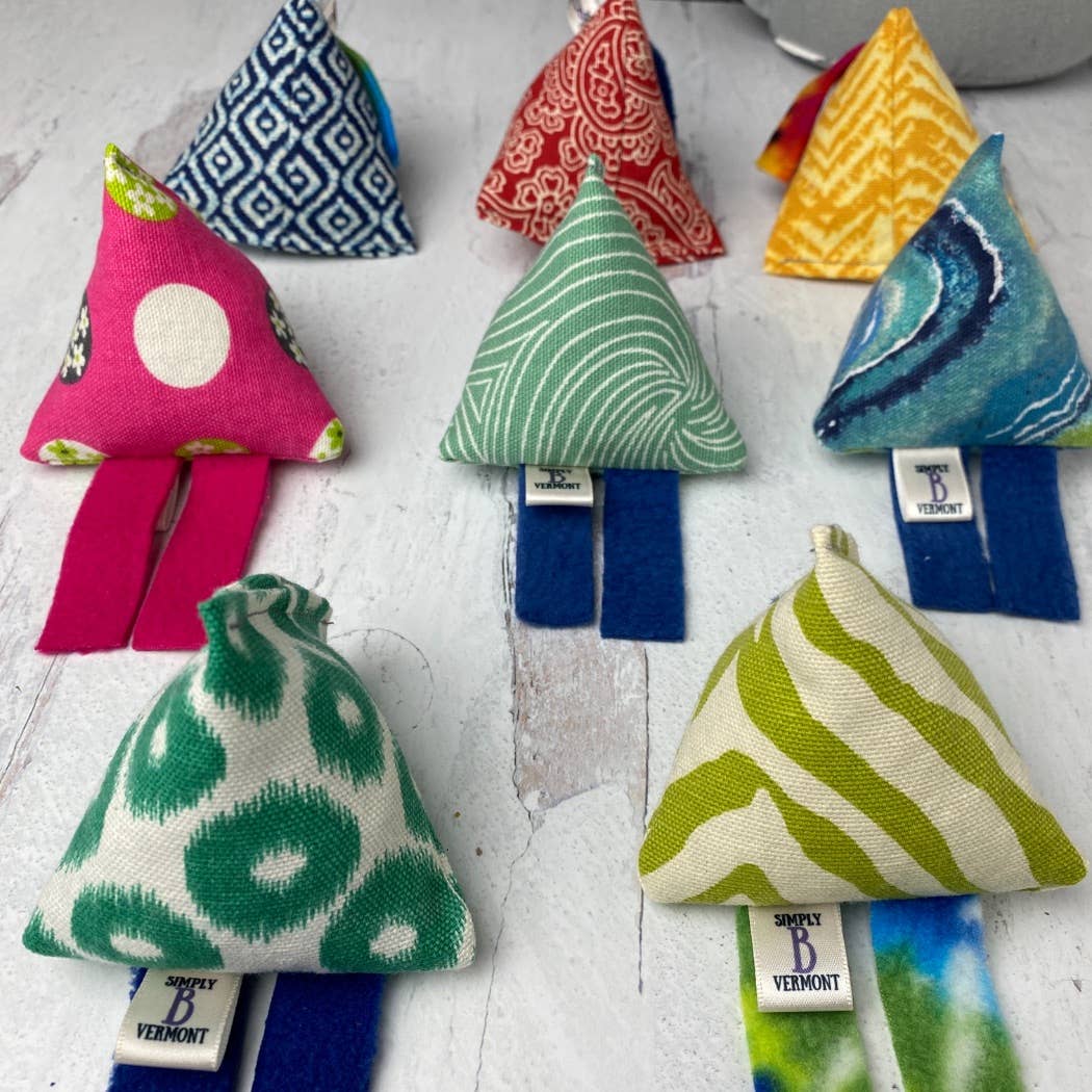 Wedge shaped cat toy made with sturdy upholstery fabric, contains B Happy our custom catnip blend. Also includes the natural crinkle of buckwheat hulls for a heightened play experience. Toy measures 3”X 3” (excluding fringe) All orders include a variety of colors/patterns.