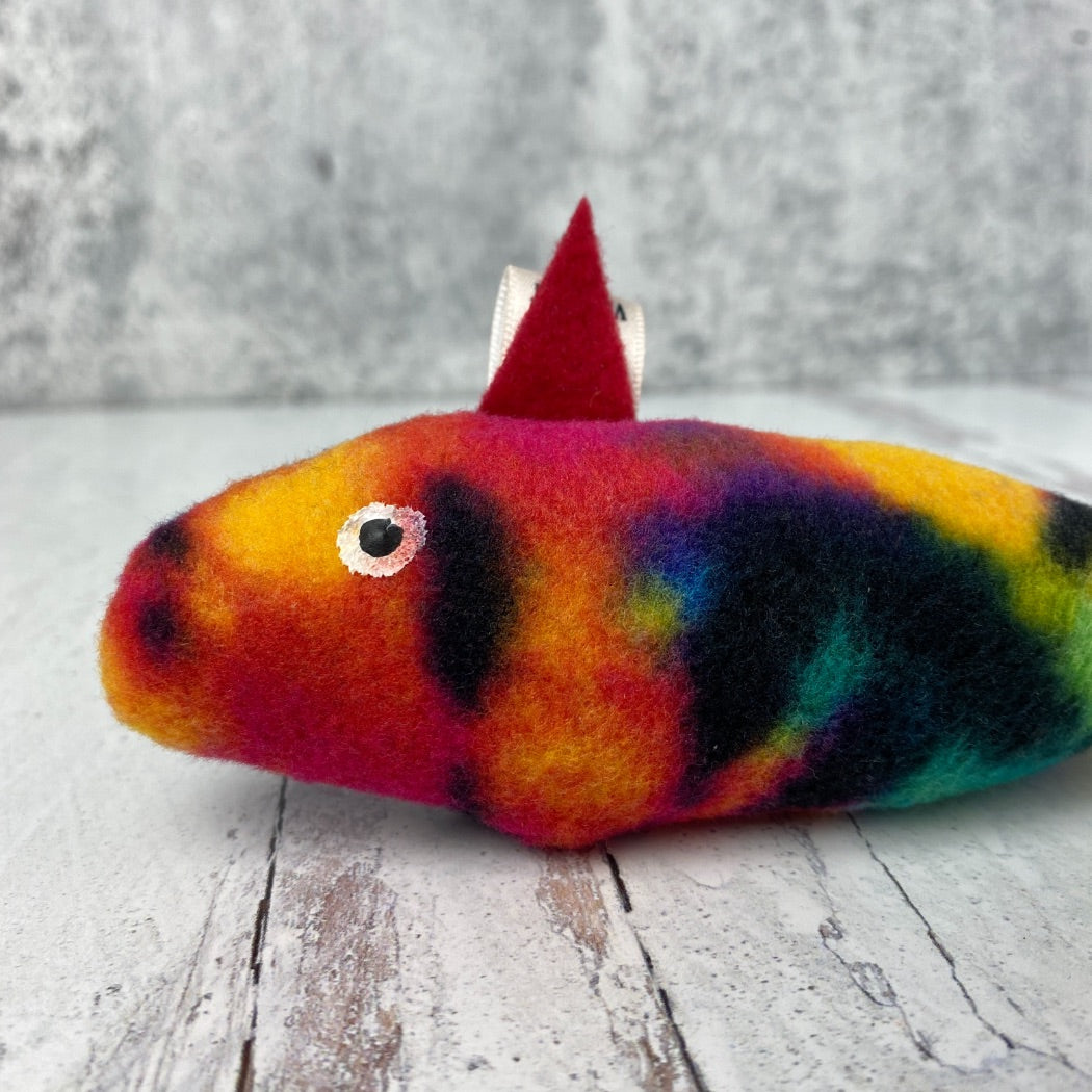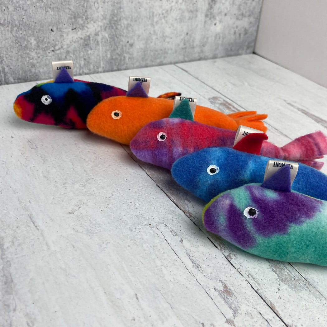 Fish-Shaped Cat toy by Simply B Vermont filled with B Happy (our custom catnip blend) Made with soft no-pill fleece, come in 5 colors.